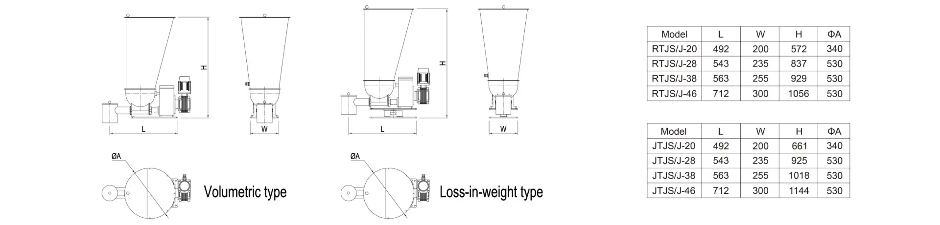 RTJS/J-additive feeder, belongs to the volumetric discharge feeder category, feed rate control is according to the screw diameter and speed, equipped with speed controller. Composed of hopper, single screw or double screw , double shaft transmission gearbox, gear motor or servo motor etc. Standard configuration is a single screw, with double screw used for viscous materials. The hopper is equipped with an agitator to prevent the material from caking. Using servo motor, the screw speed adjustable range is larger, therefor more flexible.