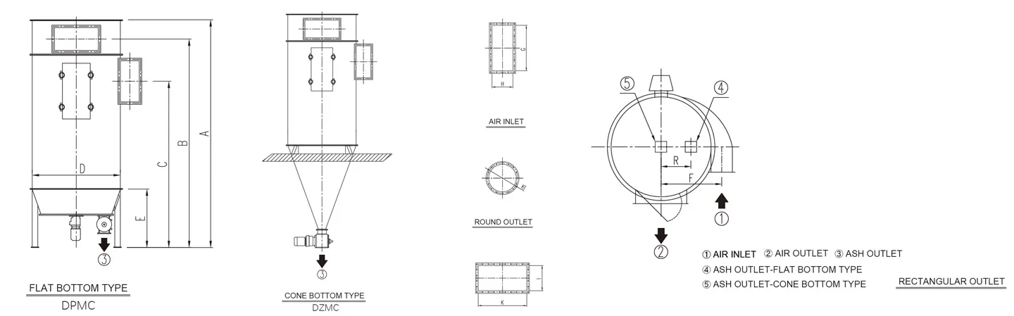 | Model | Sleeve length (mm) | Filter area (㎡) | Air vol. (m³/h) | A (mm) | B (mm) | C (mm) | D (mm) | E (mm) | R (mm) | F (mm) | H×G (mm) | KI (mm) | Air lock (kw) | Dust scraper (kw) | Low pressure blower (kw) | Weight (kg) |