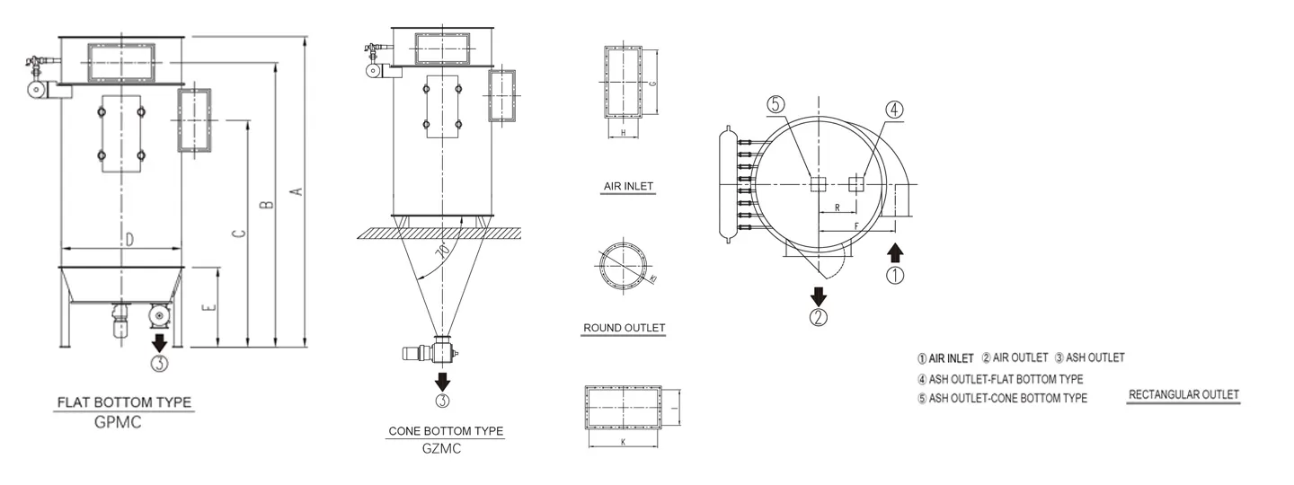 | Model | Sleeve length (mm) | Filter area (㎡) | Air vol. (m³/h) | A (mm) | B (mm) | C (mm) | D (mm) | E (mm) | R (mm) | F (mm) | H×G (mm) | KI (mm) | Air lock (kw) | Dust scraper (kw) | High pressure blower (kw) | Weight (kg) |
