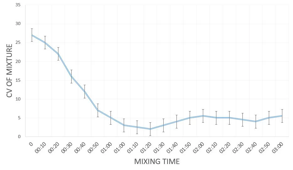 Đối với mỗi hỗn hợp, có một thời gian trộn tối ưu, tại đó vật liệu sẽ có CV thấp nhất. Thông thường, thời gian trộn sẽ vào khoảng 60 đến 120 giây. Trộn thêm sẽ chỉ dẫn đến sự phân tách.