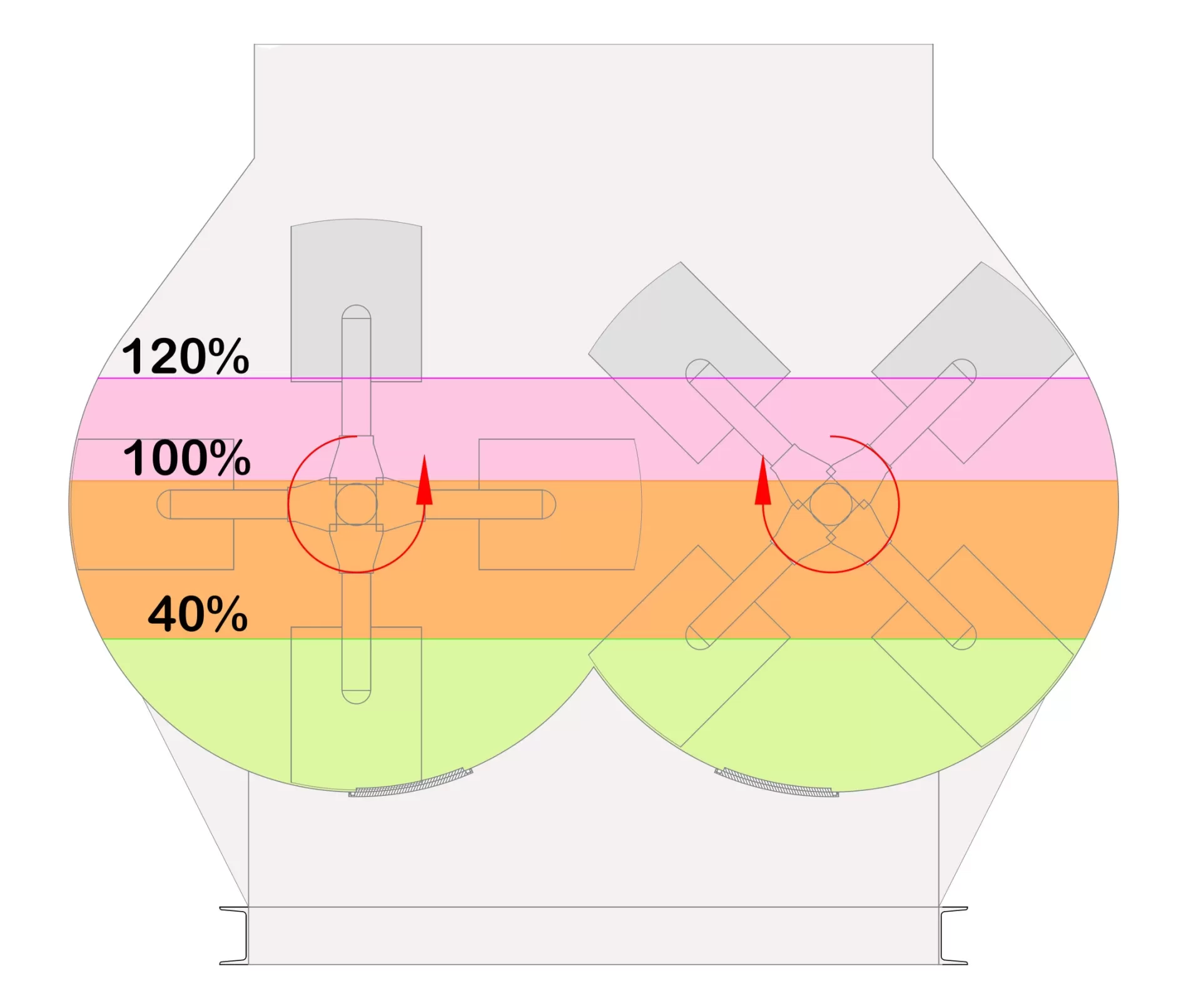 Buồng trộn của máy trộn mái chèo đôi có hình dạng giống như giọt nước. Góc đảm bảo ít hoặc không có vật liệu bám trên thành. Máy trộn này có thể hoạt động với tốc độ tải linh hoạt từ 40% đến 120% công suất hoạt động bình thường với một máy. Chuyển động của mái chèo đảm bảo vật liệu từ cả hai bên sẽ được hướng đến phần giữa và được trộn.