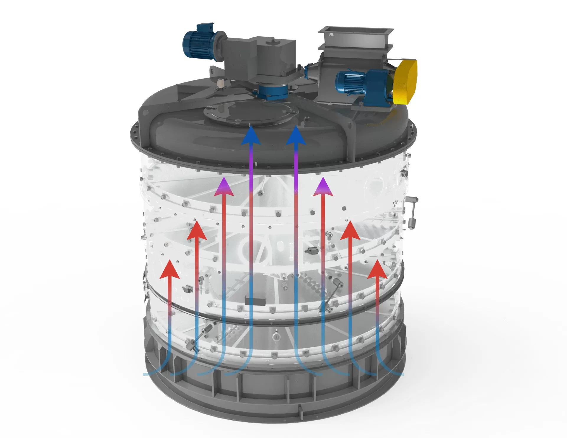 Không khí sấy đi qua sản phẩm đầu vào trong máy sấy nhiều lớp này theo một hướng dòng chảy độc đáo để đạt được sự truyền nhiệt tối đa, dẫn đến nhiệt độ khí thải thấp. Kết hợp với tuần hoàn khí sấy, thể tích khí thải giảm trong khi hiệu quả năng lượng được cải thiện.